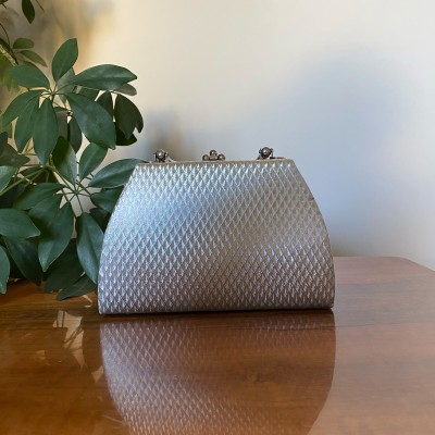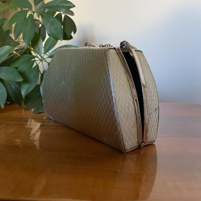 Niepowtarzalna metaliczna torebka - kuferek w kształcie trapezu, z metalowymi elementami.